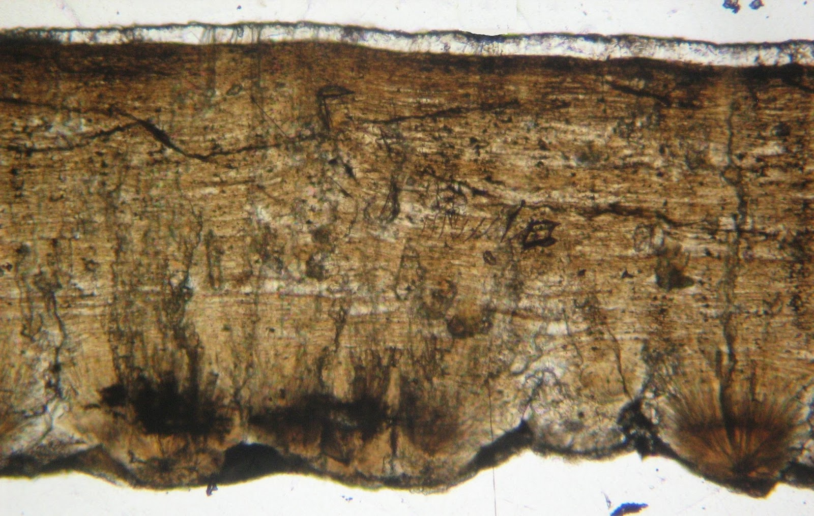 Estrutura de casca de ovo de dinossauro carnívoro visto a microscópio óptico.